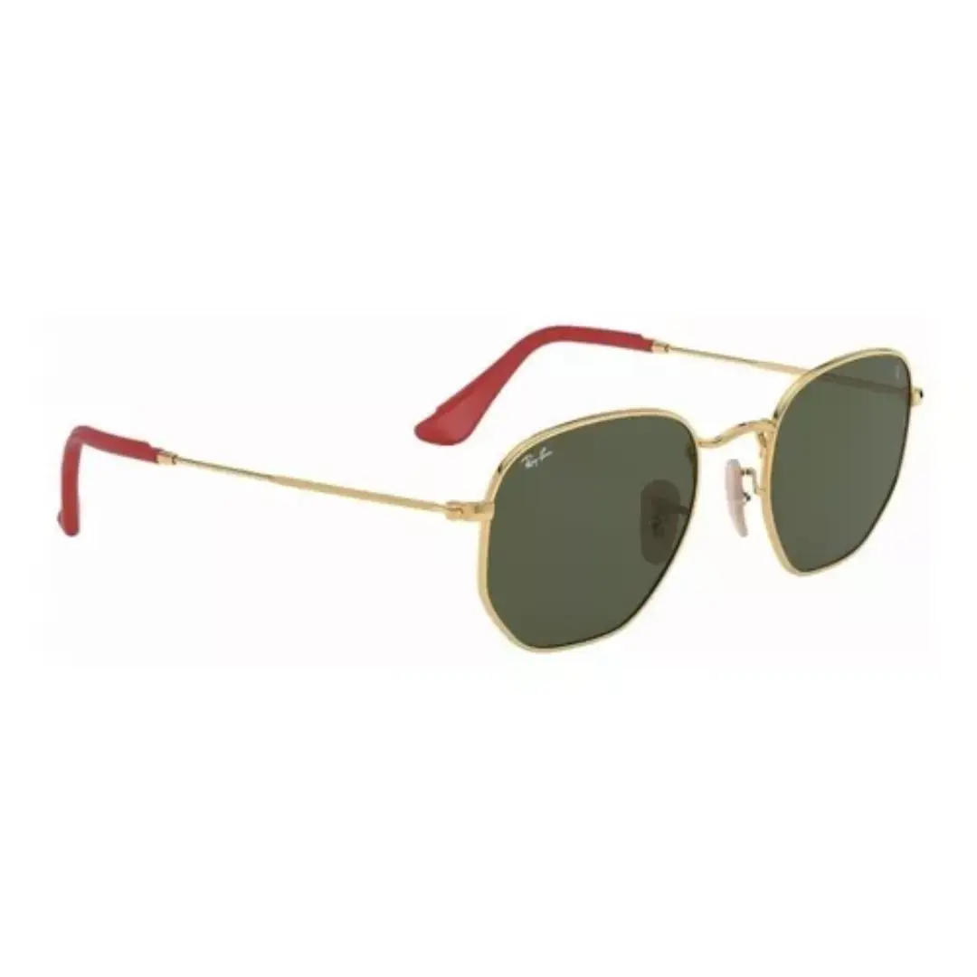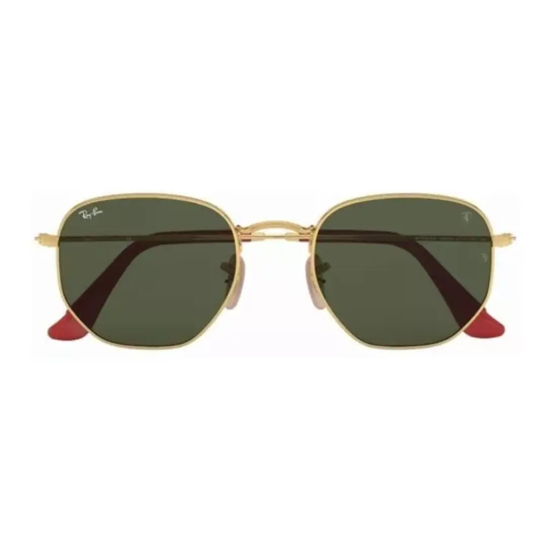 Los Ray-Ban Ferrari Hexagonal Gold Green combinan una silueta hexagonal distintiva con detalles exclusivos de la colaboración Ferrari. El armazón dorado aporta sofisticación y presencia, mientras que las patillas con punta roja refuerzan el carácter deportivo y la identidad de la escudería.