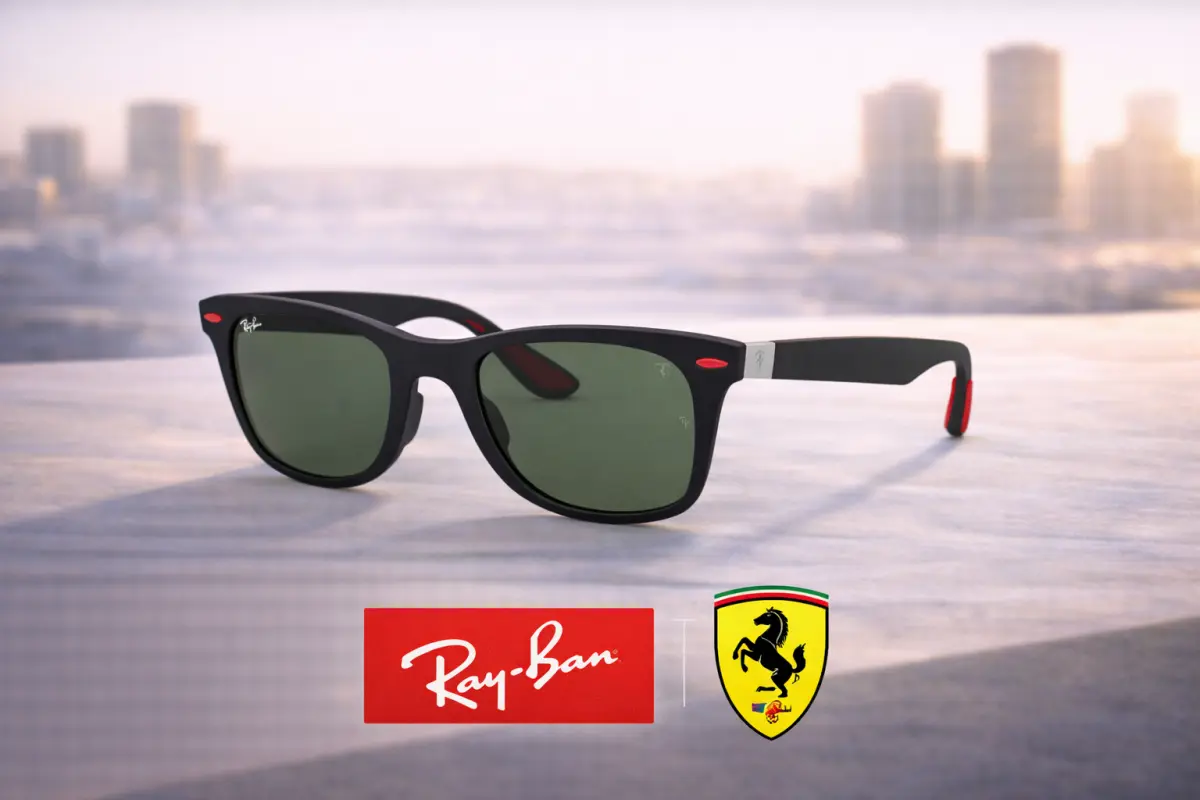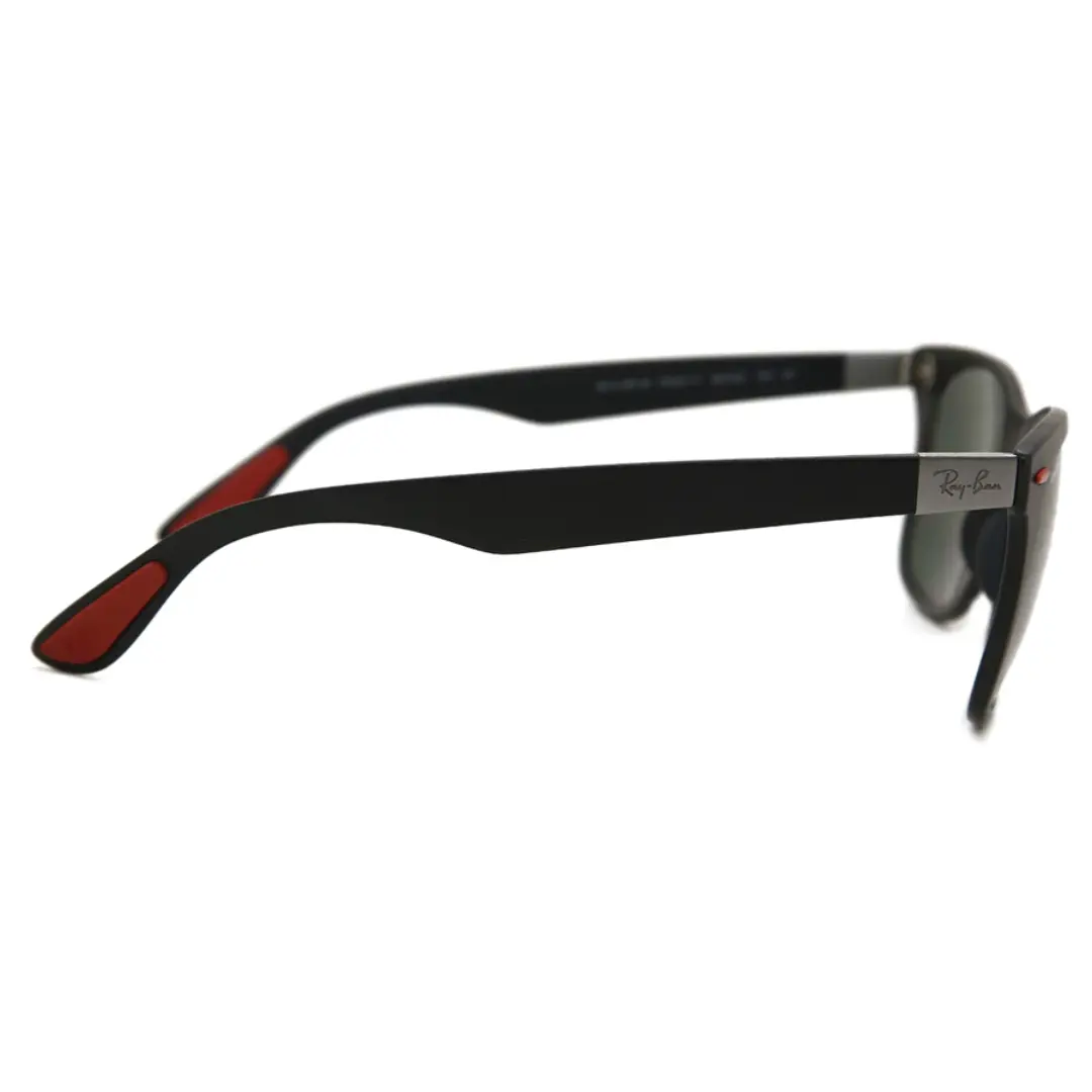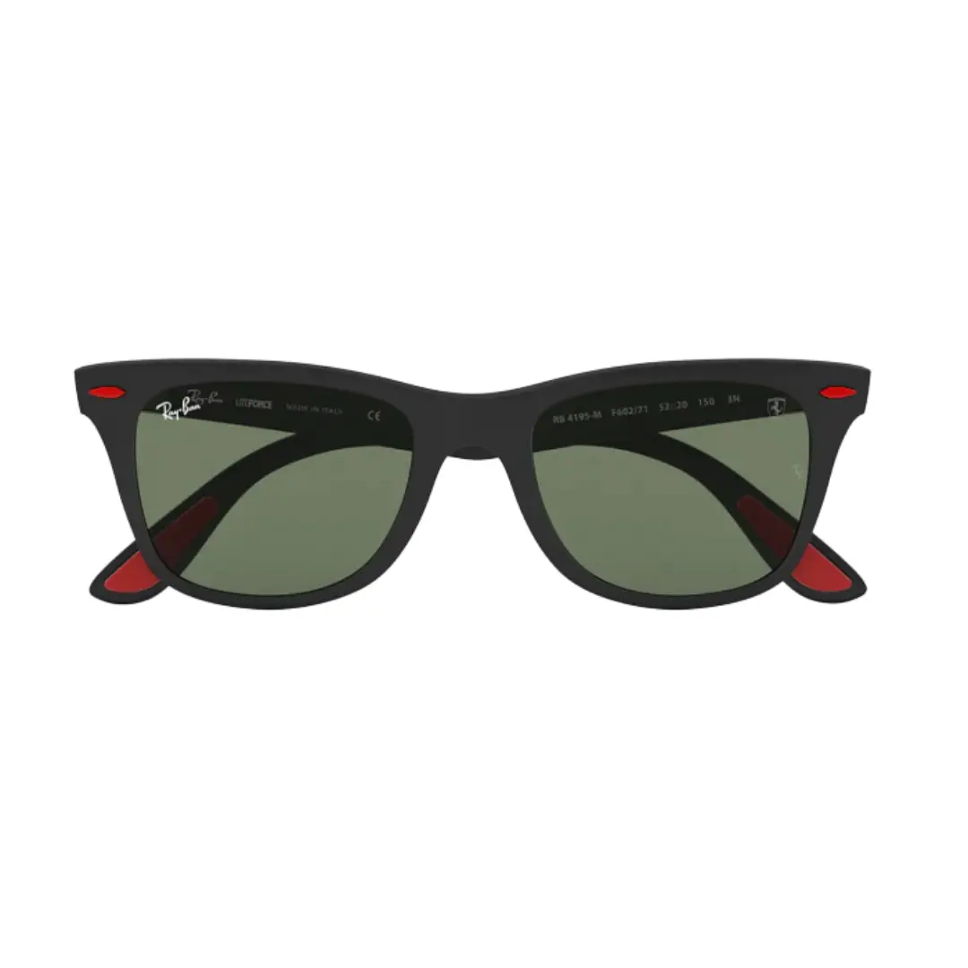 Ray-Ban Ferrari Wayfarer Liteforce con armazón negro y lente verde polarizado. Diseño icónico ultraliviano con rendimiento premium. Incluyen: estuche de cuero, paño de limpieza, certificado de autenticidad, caja plateada y sticker con código QR.